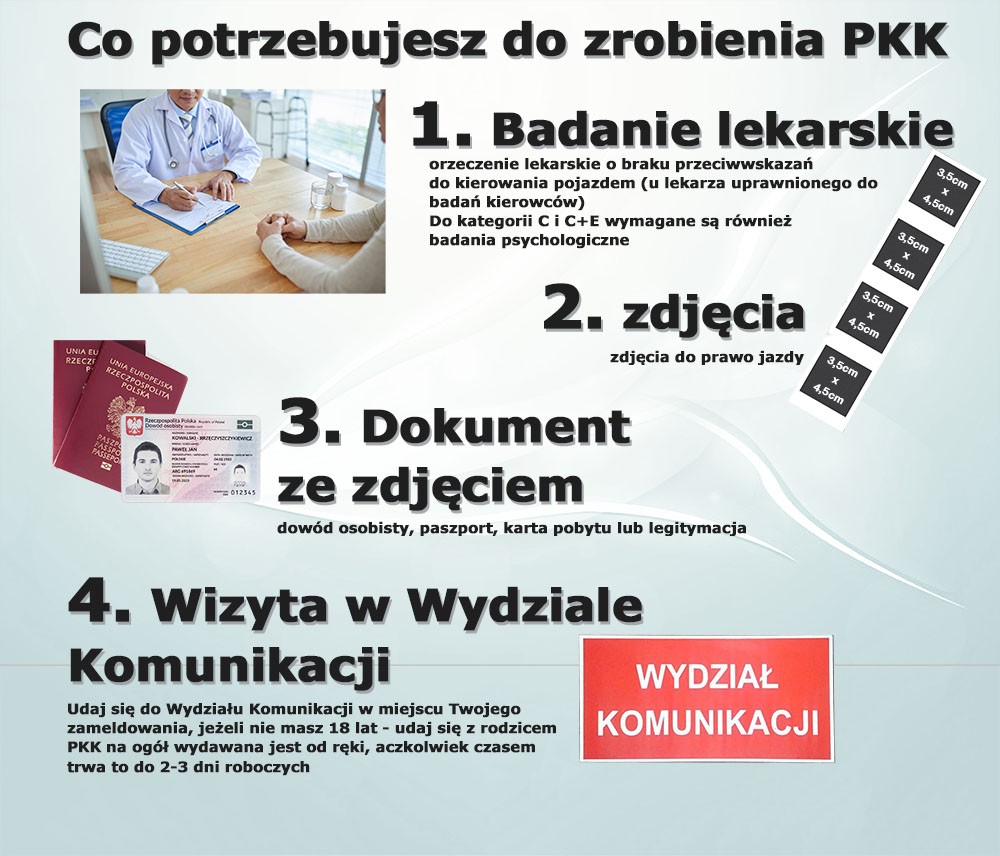1. Badanie lekarskie Orzeczenie od lekarza uprawnionego do badań kierowców o braku przeciwwskazań zdrowotnych. (Dla kategorii C, C+E – również badania psychologiczne)